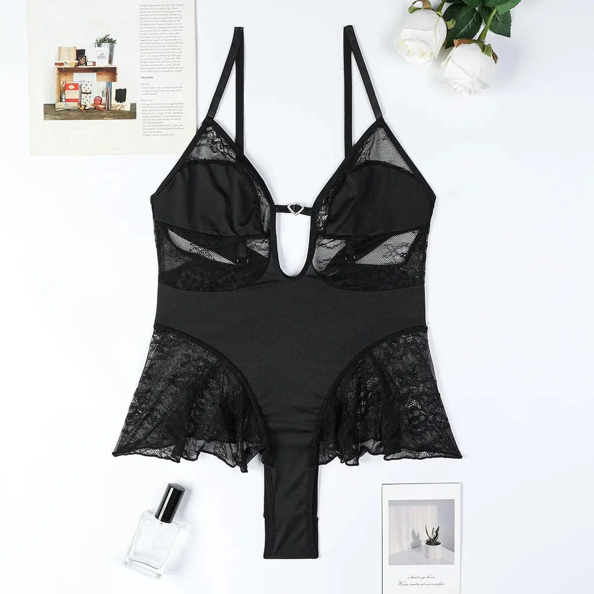 Odkryj zmysłowy urok tego body, które łączy w sobie elegancję i odwagę. Koronkowe wstawki oraz wycięcie w dekolcie sprawiają, że staje się ono idealnym wyborem na wyjątkowe okazje, podkreślając Twoje kobiece kształty.