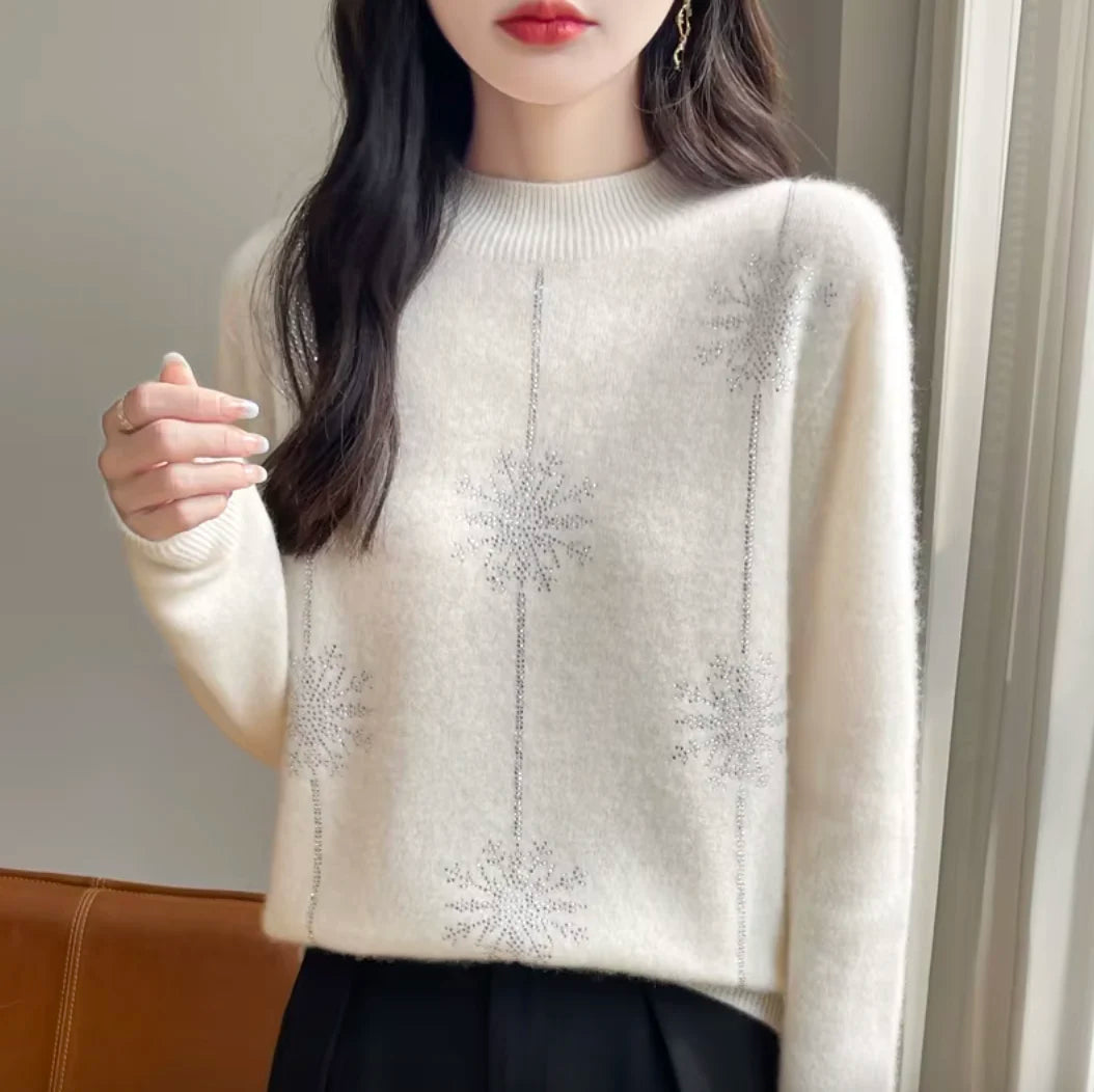 Subtelny blask cyrkonii dodaje całości elegancji, a świąteczny motyw śnieżynek tworzy niepowtarzalny, zimowy klimat. Sweterek świetnie prezentuje się w połączeniu z klasycznymi jeansami, spódnicą czy eleganckimi spodniami.