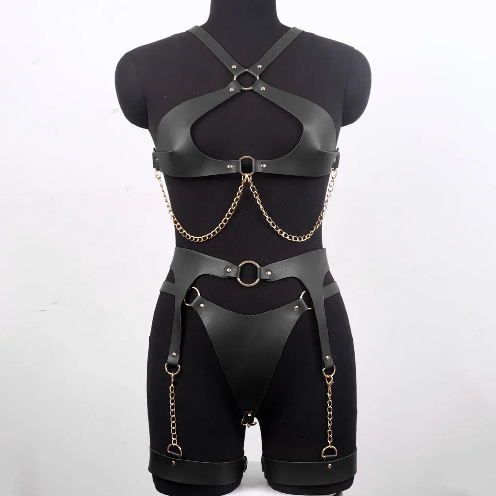 Komplet skórzanej bielizny z metalowymi łańcuszkami